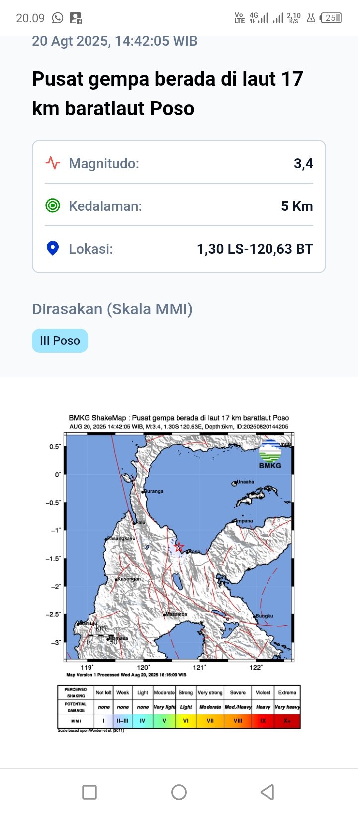 JABARINSIDE.COM | Poso, Sulawesi Tengah – Gempa bumi dengan magnitudo 3,4 mengguncang wilayah Poso pada Rabu (20/8/2025) pukul 14.42 WIB. Berdasarkan laporan BMKG, pusat gempa berada di laut sekitar 17 km baratlaut Poso, dengan kedalaman 5 km.