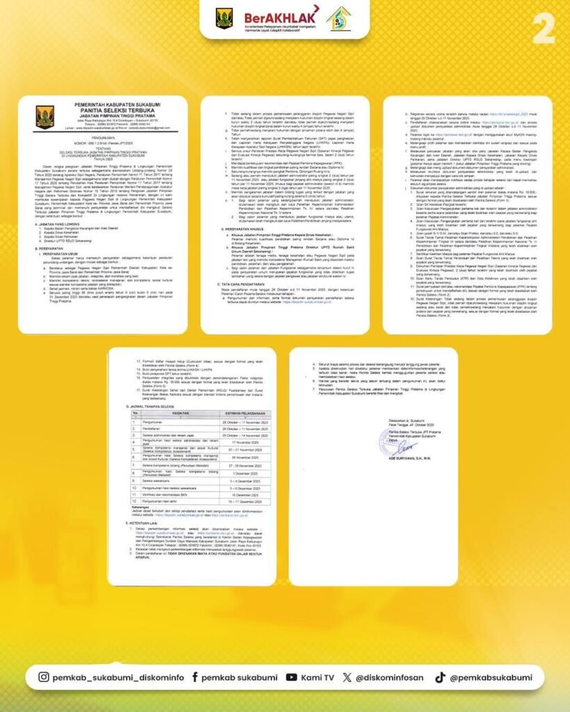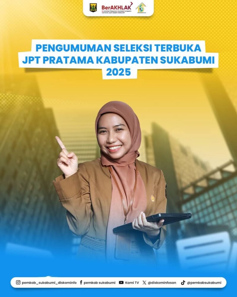 JABARINSIDE.COM | SUKABUMI – Pemerintah Kabupaten Sukabumi melalui Panitia Seleksi Terbuka Jabatan Pimpinan Tinggi (JPT) Pratama resmi membuka kesempatan bagi Aparatur Sipil Negara (ASN) untuk mengisi empat jabatan strategis di lingkungan Pemkab Sukabumi.