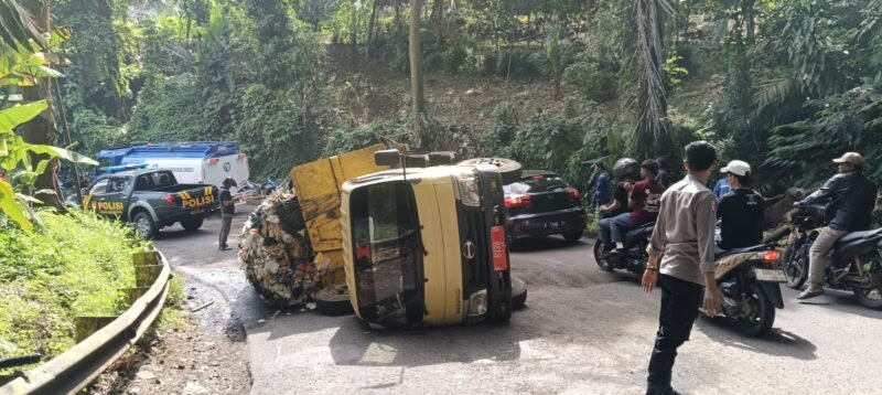 JABARINSIDE.COM | SUKABUMI — Sebuah truk pengangkut sampah milik Dinas Lingkungan Hidup (DLH) Kabupaten Sukabumi mengalami kecelakaan tunggal dan terguling di wilayah Kampung Baeud, Kecamatan Warungkiara, Selasa (25/11/2025). Kejadian tersebut dipicu upaya sopir menghindari lubang besar di ruas jalan yang kondisinya rusak parah.