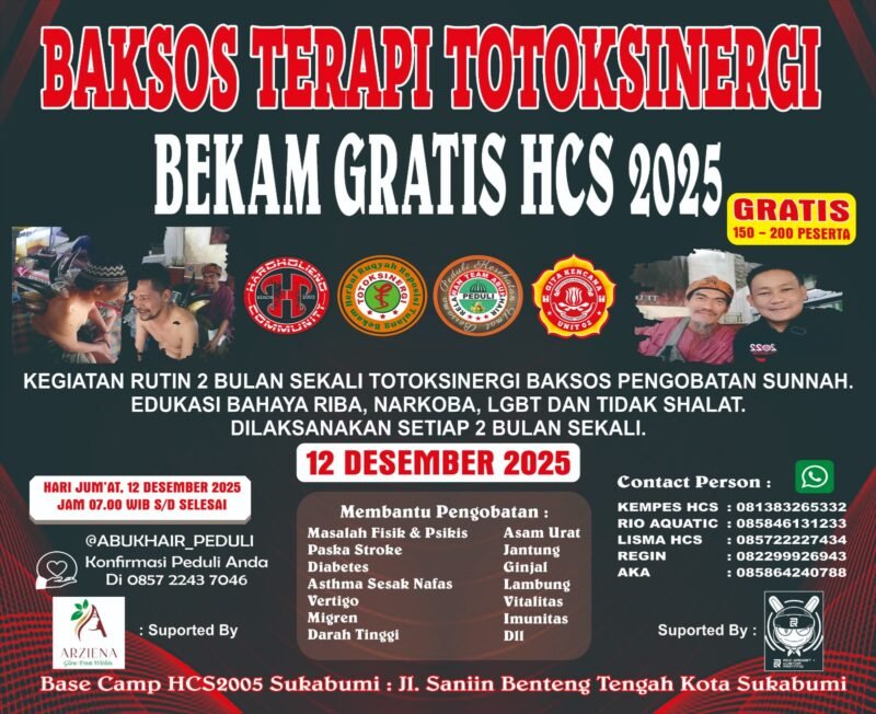 JABARINSIDE.COM | Sukabumi — Gelombang antusias warga memadati Base Camp Hardholiend Community Since 2025 (HCS) di Jalan Saniin, Benteng Tengah, Kota Sukabumi, Jumat pagi (12/12/2025). Sejak pukul 07.00 WIB, ratusan peserta sudah antre untuk mengikuti layanan totoksinergi dan bekam gratis, program sosial kesehatan alternatif yang kini menjadi agenda tetap dua bulanan HCS.