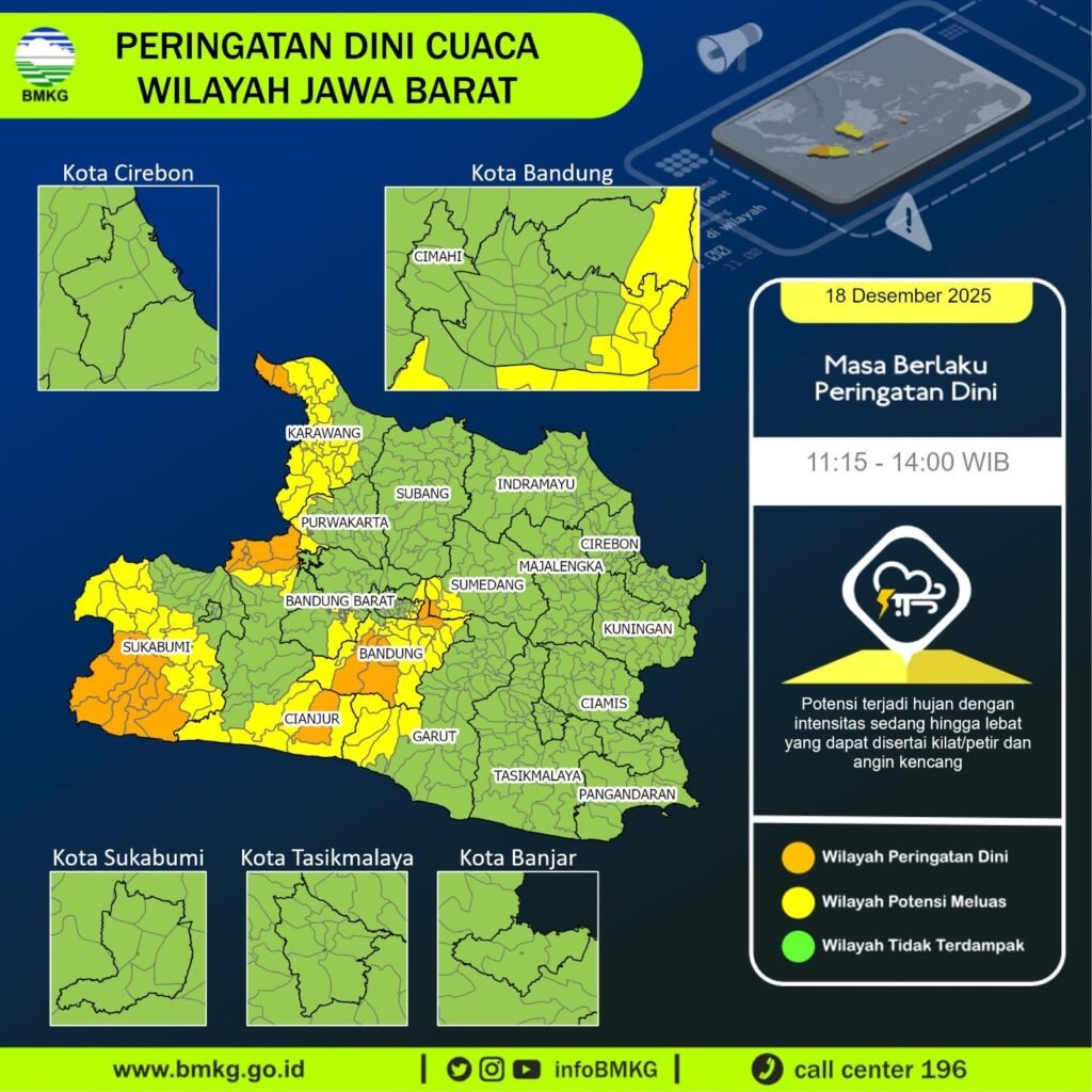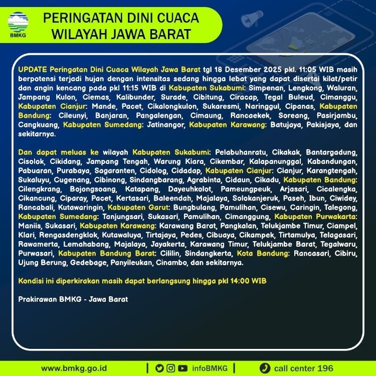BPBD mengimbau masyarakat untuk tetap waspada, mengingat berdasarkan peringatan dini BMKG, wilayah Kabupaten Sukabumi masih berpotensi mengalami hujan sedang hingga lebat yang dapat disertai angin kencang dan petir.
