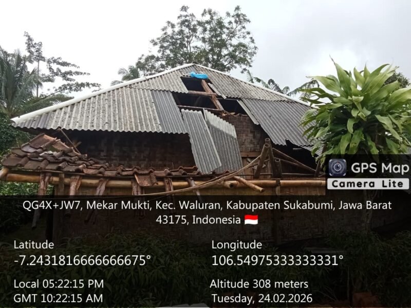 Sementara itu di Kampung Sukasirna RT 002 RW 001, Desa Mekarmukti, Kecamatan Waluran, hujan deras disertai angin kencang pada Selasa (24/2/2026) pukul 02.30 WIB menyebabkan lima lembar asbes atap rumah milik Bapak Ata terlepas dan terbang tertiup angin.