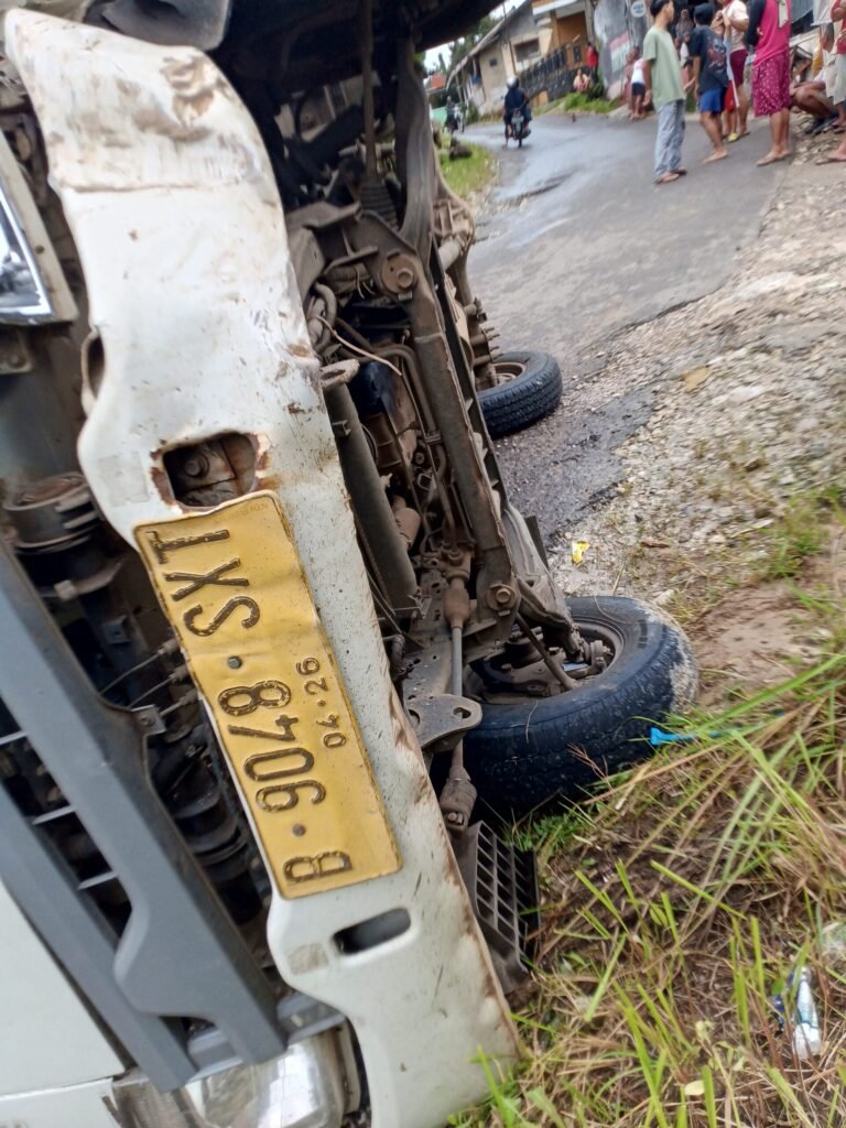 Akibat benturan keras tersebut, bagian kiri kendaraan ringsek parah setelah menghantam dinding pagar beton, lalu mobil terbalik ke sisi kanan jalan.
