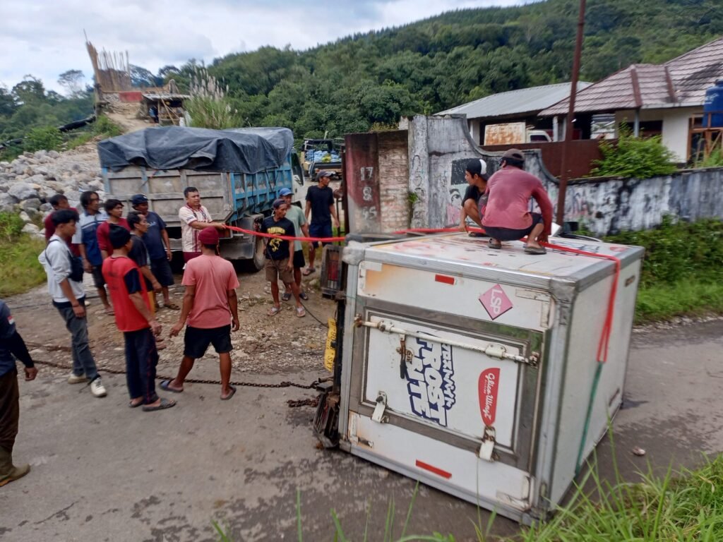 JABARINSIDE.COM | SUKABUMI – Sebuah mobil box bermuatan es krim terbalik di Jalan Tenjojaya, tepatnya di depan Perum Bolo 2, Kampung Bantar Muncang, Desa Sekarwangi, Kecamatan Cibadak, Kabupaten Sukabumi, Jawa Barat, Jumat (28/2/2026) sekitar pukul 09.00 WIB.