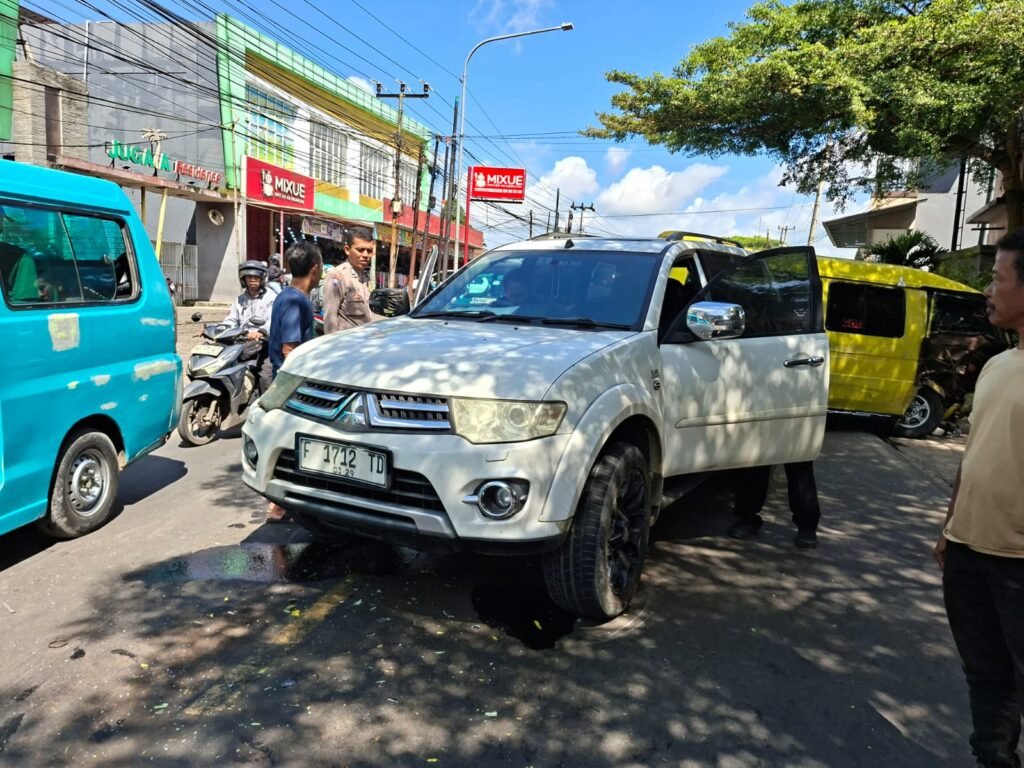 JABARINSIDE.COM | SUKABUMI – Kecelakaan lalu lintas terjadi di Jalan Raya Salamanja, Desa Batununggal, Kecamatan Cibadak, Kabupaten Sukabumi, Jumat (13/3/2026). Sebuah minibus Bogoran dengan nomor polisi F 7967 SB bertabrakan dengan mobil Pajero F 1712 TD di depan Perumahan Jugala Residence dan Hotel Sakinah Syariah.