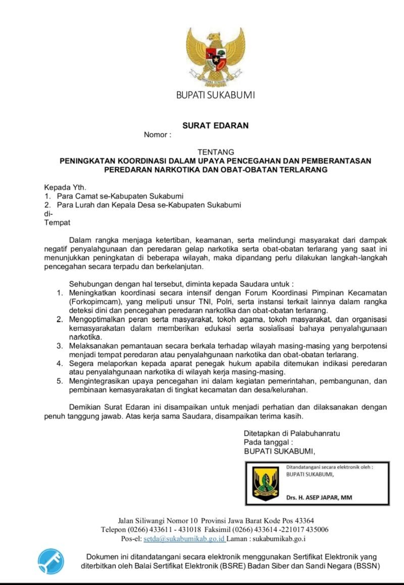 Surat edaran tersebut ditujukan kepada para camat, lurah, dan kepala desa se-Kabupaten Sukabumi. Dalam kebijakan itu, pemerintah menilai adanya peningkatan indikasi peredaran narkotika di sejumlah wilayah yang dinilai sudah mengkhawatirkan.