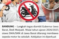 JABARINSIDE.COM | BANDUNG – Langkah tegas diambil Gubernur Jawa Barat, Dedi Mulyadi. Mulai tahun ajaran 2026/2027, siswa SMA/SMK di Jawa Barat dilarang membawa sepeda…
